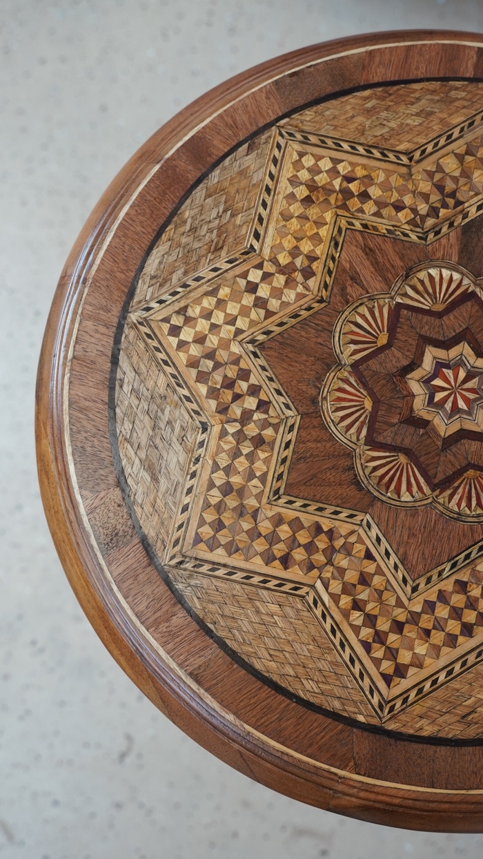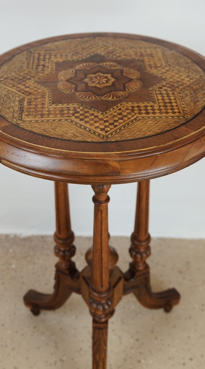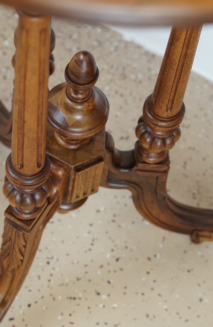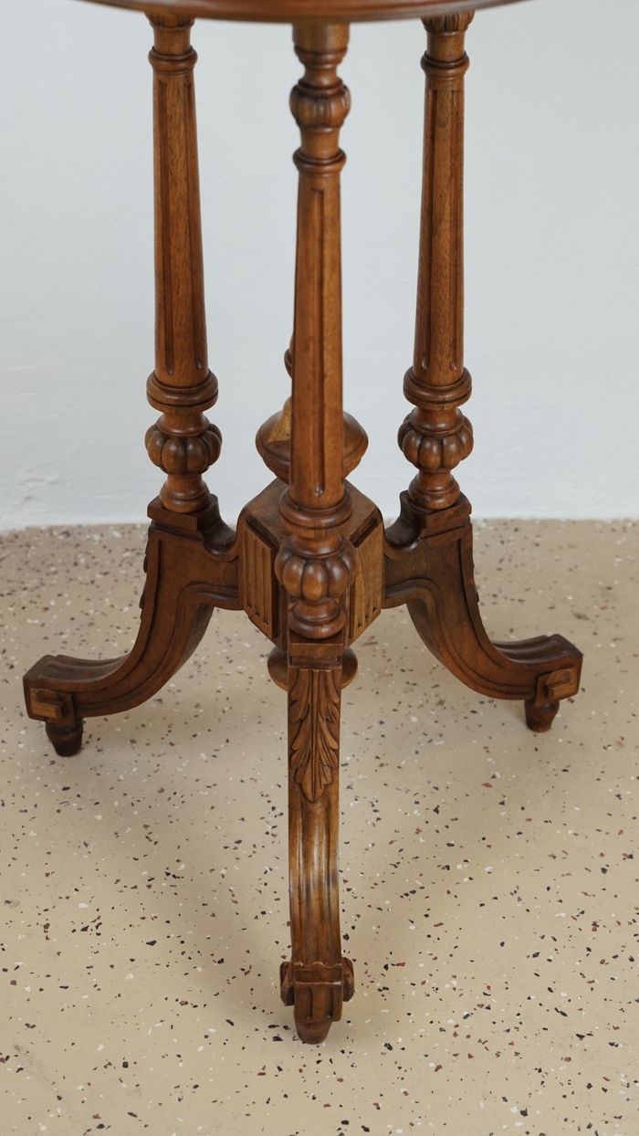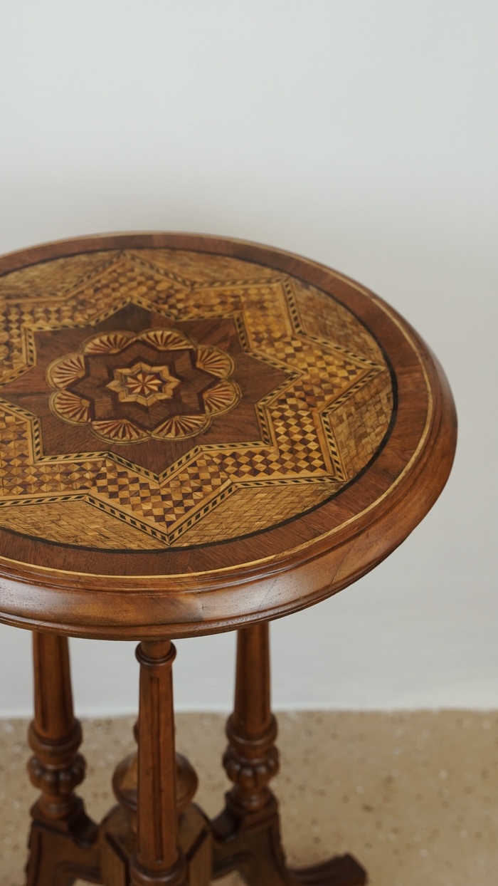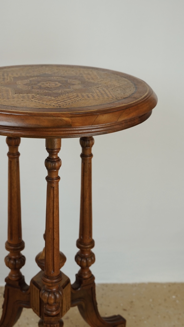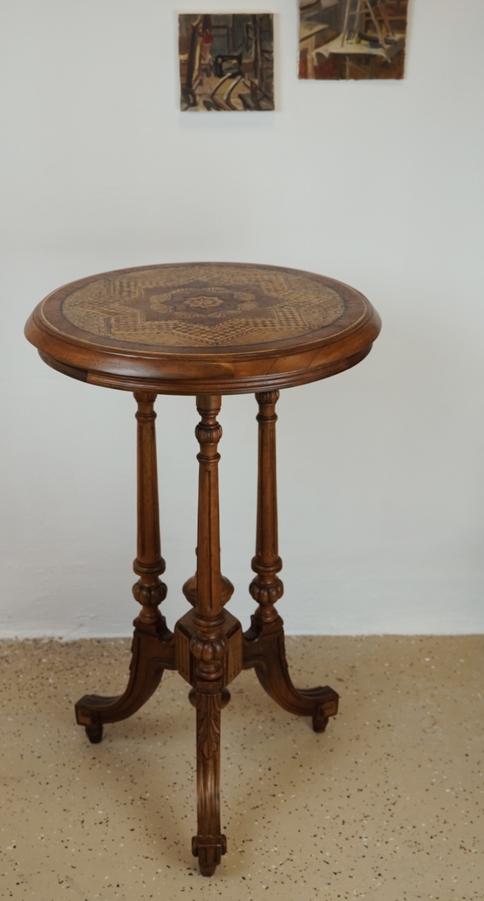 Столик из массива ореха. Набор маркетри из разных пород шпона, включая красного дерева и белого грецкого ореха.
