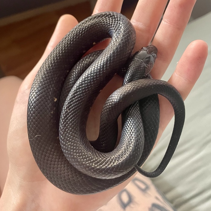 Мексиканская черная королевская змея! Невероятно красивая. На видео выше происходит процесс охоты за мышкой, а я мешаю, чем сильно ее бешу.