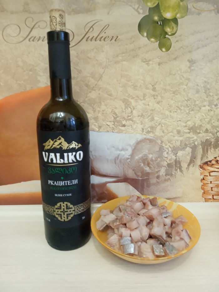 Рыбное филе очистить от шкуры и костей, нарезать небольшими кубиками, залить вином, периодически перемешивая, чтобы лучше промариновалась.