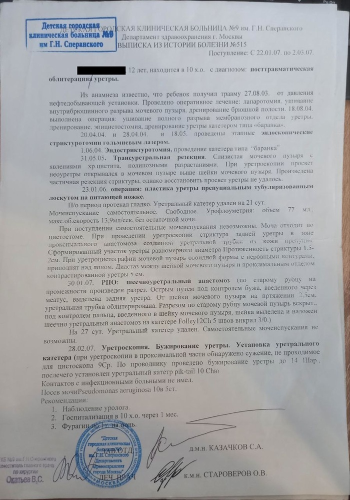 2. У меня ушиб, сотрясение и размозжение обоих полушарий мозга, разрыв брюшной полости, отрыв мочевого пузыря, раздробленные тазовые кости, раздробленные ноги, и всякие мелкие царапины. К сожалению, самую первую выписку я найти не смог, нашёл только первую московскую, когда я лежал в урологии.
