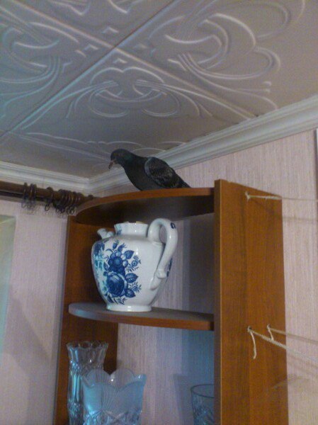 День. На улице дождь и сижу залипаю в интернете. Тут слышу испуганный голос матери из комнаты "Мамочка!". Пришла туда и вижу, как это чудо в перьях сидит на шкафу как будто, так и нужно и пырит на нас оттуда. Видать решил у нас переждать дождь. Шоку моему не было предела, ибо хоть у нас голуби и живут над квартирой под крышей (последний этаж), но такой чертовщины ещё не совершали. Благо выгнала я его быстро, хотя был момент, когда испугалась как бы он себе крылья не переломал, пока пытался свалить через закрытое окно. Но впечатлений мне хватило на долго)