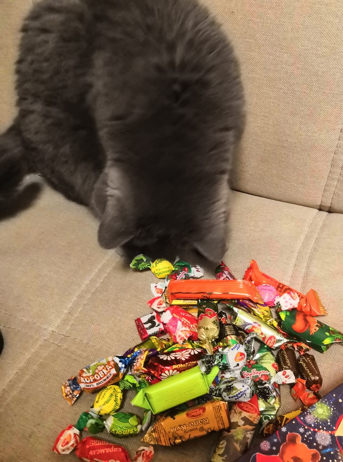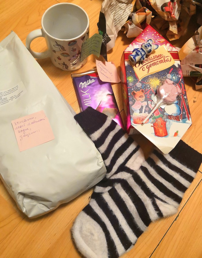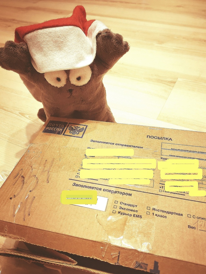 Посылка успешно получена очень ответственным доверенным лицом. Инспекция проведена котосантой (кстати, подарок снегурочки в прошлом обмене), пока серая пушистая и ленивая жопа устраивала умывания после ужина.