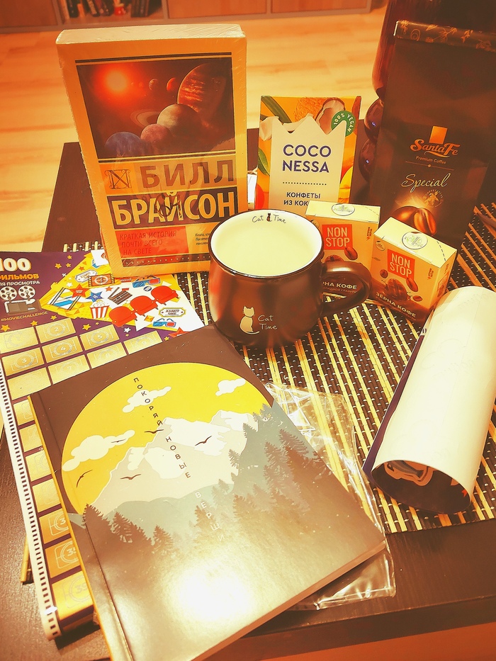 И...вздох облегчения, что в коробке не старые сапоги (вспоминаем каждый год). Снегурочка очень постаралась, попала по всем направлениям и даже более. Кофе с вишней - это просто бомба (не указывала в анкете, но примерно как я маньячу по кофе, так же обожаю вишню в разных ее съедобных и ароматических вариациях). Зерна в шоколаде - вау, вкуснючие кокосовые конфеты, очень милая кружка с котиками похожая на ведьмачий котелок (как раз искала новую необычную на работу), интересная книга (упустила такую, обязательно прочту), мотивирующий ежедневник с горами (моя прелесть..) и крутая штука в виде скретч-карты movie challenge (однозначно моя тема, как сумасшедшего фильмофила, часто мучаюсь с выбором что бы пересмотреть или где найти новый киношедевр для вечерних посиделок).