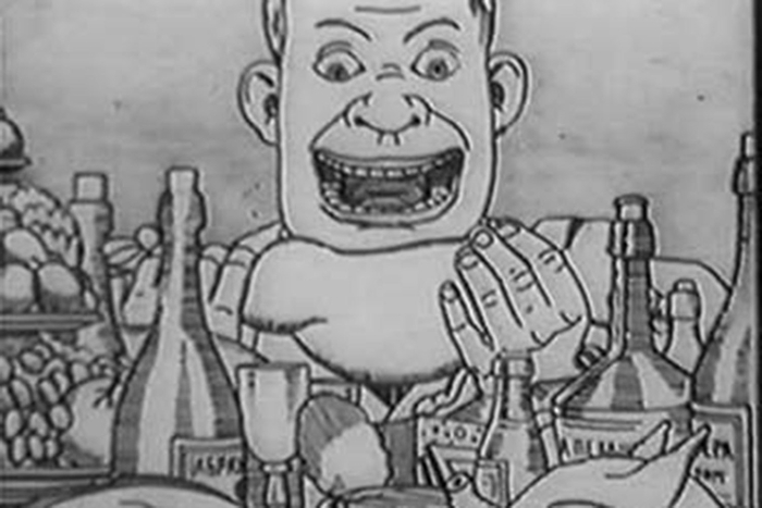 Теперь сюжет. Тут, как говорится, уберите ваших детей от наших экранов. Буржуй сидит за столом и жpёт. Кидает в огромный рот все подряд: порося, рыбу, фрукты, сыры, вина...