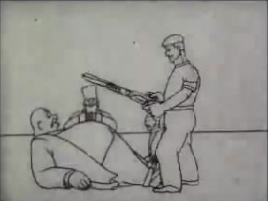 Затем к Буржую подходит Рабочий с большим молотком, а следом - два Священника, один из старой церкви, другой из обновленческой. Служители культа устраивают потасовку, которая больше похожа на вальсирование, Рабочий смеется над Буржуем и над священниками, а потом приносит огромные ножницы и пытается прорезать Буржую брюхо. На ножницах написано "пуд" и "аршин". Ножницы, как я понимаю, символизируют что-то типа экспроприации ценностей.