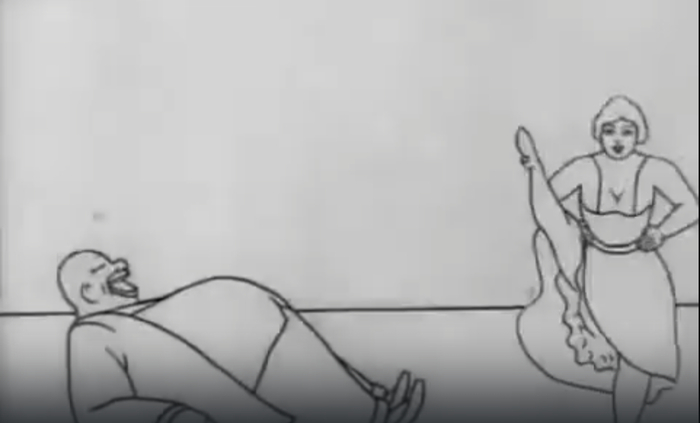 Представляю, какую ненависть он должен был вызывать у зрителей, большинство из которых такое роскошество даже на картинках не видели. Обожpaвшись до невменяемого состояния, Буржуй падает на пол и требует себе женщин. Ему является та самая барышня с низкой социальной ответственностью и начинает вокруг него выделывать коленца, канкан танцевать: