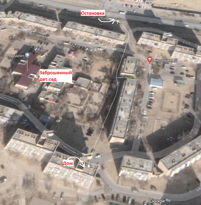 Я иду со школы, после автобуса с остановки до дома, где-то 350-400 метров. Всего 2 дома пройти по открытой аллейке рядом с садиком (на картинке мой путь это белая тонкая полоска).