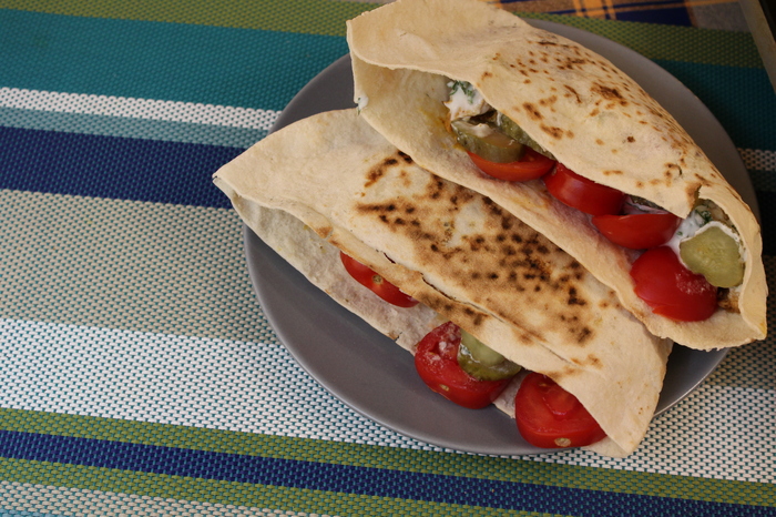 4) Сборка: большую питу разрезала пополам и в получившийся карман, сложила салат, нарезанное запеченное мясо, соус, маринованные огурчики и помидорки.