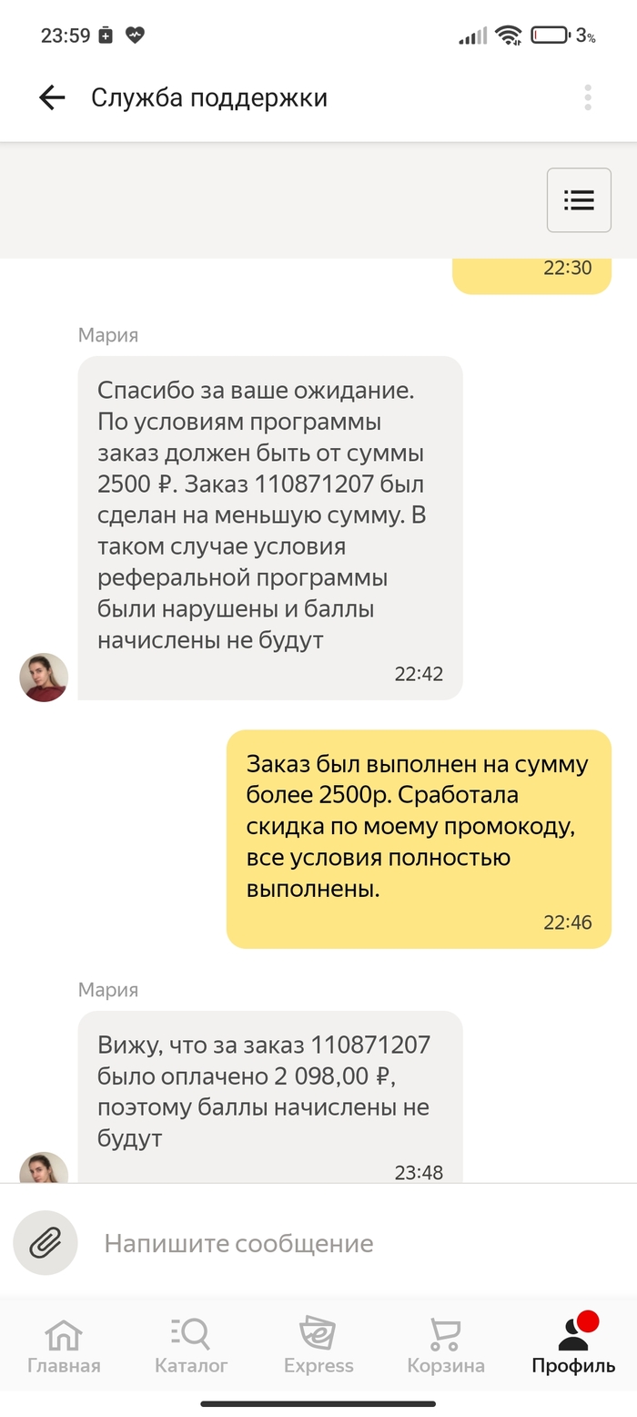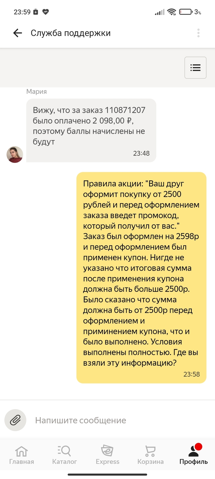 Кратко в чем суть. Был оформлен заказ в Яндекс Маркете на сумму 2598р по реферальному промокоду. Суть в том что при приглашении друга по моему промокоду и его заказу на сумму от 2500р, ему делается скидка в 500р, а мне 500р возвращаются баллами на Яндекс плюс.