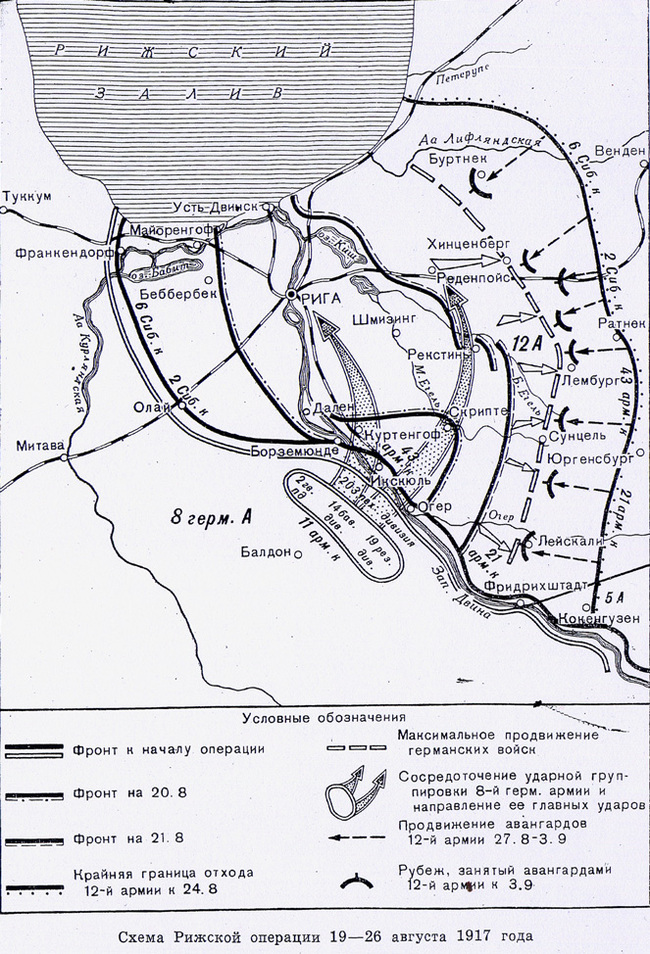 Развивается наступление Немцев на Рижском фронте. После арт. подготовки и успешных атак немцам удалось навести два понтонных моста у Икскюля (в наше время город Икшкиле). Не смотря на уничтожение одного из двух мостов артиллерией противник переправился на восточный берег Двины.