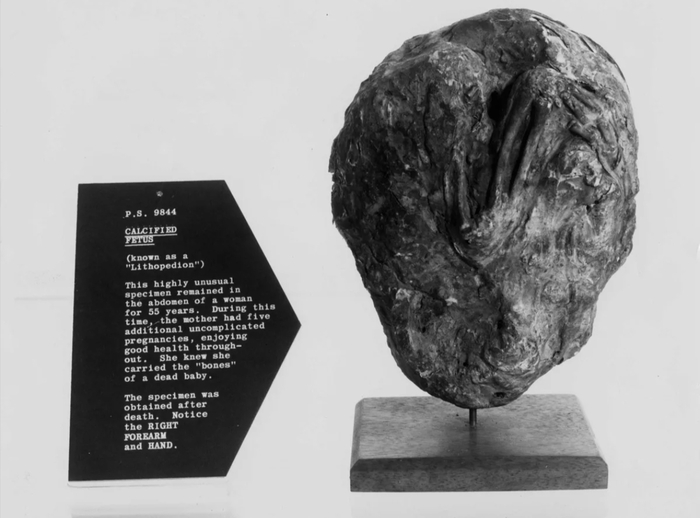 Литопедион переводится с греческого как "каменный ребенок". Это происходит, когда у женщины наступает внематочная беременность, при которой плод умирает, но становится слишком большим, чтобы его можно было реабсорбировать в ее организме. Внематочная беременность - это когда плод растет вне фаллопиевых труб или матки.Каменные дети могут родиться при абдоминальной внематочной беременности, когда плод растет в брюшной полости.Мертвый плод остается там, со временем образуя кальциевую оболочку и затвердевая в рамках естественной реакции иммунной системы. С одной стороны, эта оболочка защищает мать от инфекции, но с другой, остаётся незамеченной десятилетиями.Каменные дети невероятно редки, но могут возникать всего с 14 недель беременности вплоть до 9-ти месячного срока.И хотя количество зарегистрированных случаев невелико, нет ничего необычного в том, что он десятилетиями остается недиагностированным.