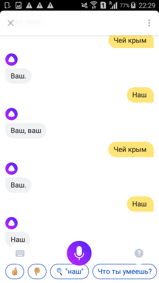 Kivanov21 8 лет назад Бот Алиса. Крым наш ? Показать полностью 2 [моё] Крым Крым наш Моё Скриншот Яндекс Длиннопост Яндекс Алиса