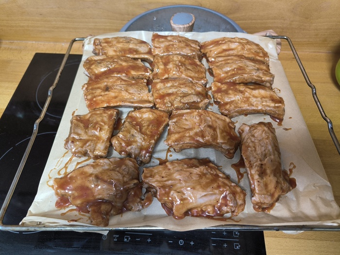 Решил попутно пилить пост, а не по результату, увлекся и пролюбил момент, ребрышки остались в духовке на 35 минут и чутка "подрумянились". Первое правило готовки: готовишь - сиди на кухне, ушел - пролюбил.