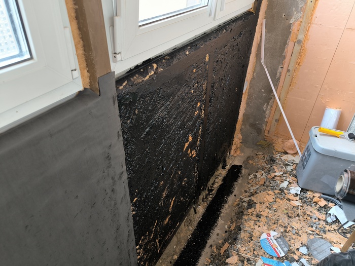 Снял старый утеплитель. Все стыки, углы и любые места, где мне казалось могло протекать, промазал битумным герметиком. Все стены прошел битумной мастикой и сверху на нее поклеил рулонный гидроизол для пола от технониколь. Как раз наступили похолодания, самая пора для работы с битумными материалами. Мастика не мазалась даже шпателем, почти сразу он отказался работать и со словами: - братан, я все, сломался. Купил строительный фен, грел им мастику в ведре, брал кистью и грел места нанесения. С горем пополам и тремя ожогами от капнувшего битума я закончил за пару дней. А, делал я все это в выходные, благо у меня они плавающие. Вот клеить самоклеящуюся гидроизоляцию было легко и приятно, кроме того момента как лист упал мне на руку. Отдирать с волосами это добро - стремное удовольствие.