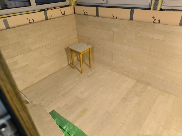Стены хотел чтоб были из дерева, но не вагонку. Решил, что зашью паркетной доской, выбрал, посчитал, на весь балкон нужно на 80 тысяч. Жаба сказала -Ква, иди думай. Плюсом, я не хотел лакированные паркетные доски, хотел живое дерево и покрасить. В итоге вспомнил про авито, залез и нашел б\у, которые прогнали через шлифовку. Съездил в дмитров, всего два часа туда и два обратно. Вот процесс.