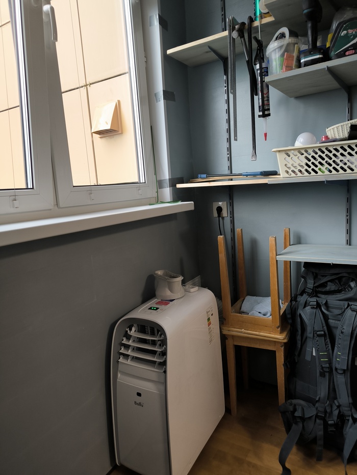 В углу, заранее проложил воздуховод для подключения напольного кондиционера. Не делайте его из сотки никогда. Я думал, что хули воздуху? Труба и труба. Заужение привело к тому, что датчик компрессора грелся и вырубал кондей. А в родную 125-ю трубу дул как миленький. Но об этом я узнал только вчера, когда весь ремонт закончил и включил кондей, а он меня послал в горы)