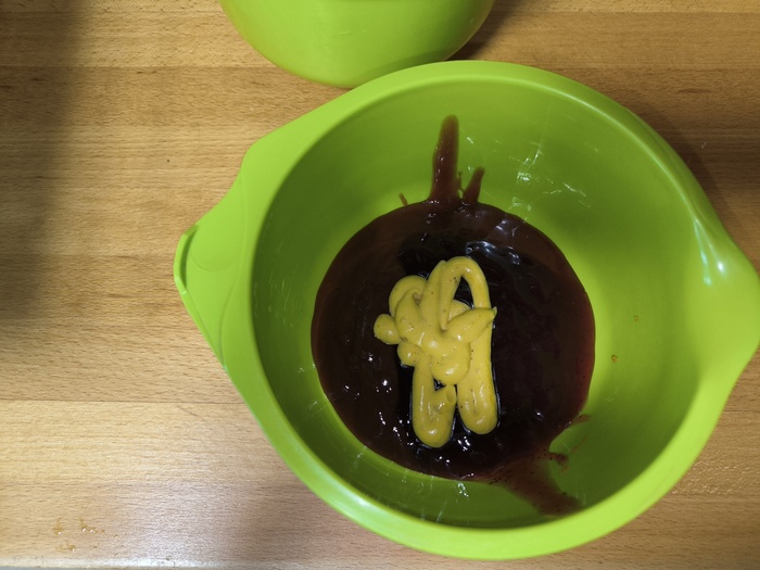 Готовлю соус. Упаковка барбекю 200 гр., упаковка брусничного 200гр., и грамм 30-50 горчичного.