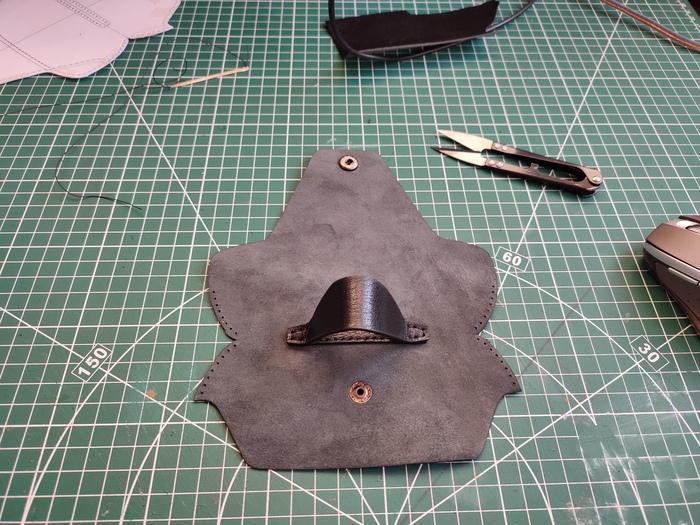 Собрав волю в кулак, а так же остатки кожи от предыдущей сумки, приступил к изготовлению сумки на грудь. Каким-то образом умудрился похерить фотки с началом процесса изготовления выкройки и заготовок, поэтому фото будут с середины. По сути, ничего особенного, выкройка, вырезание заготовок, сшивание.