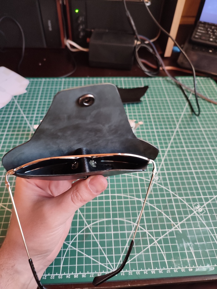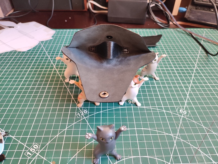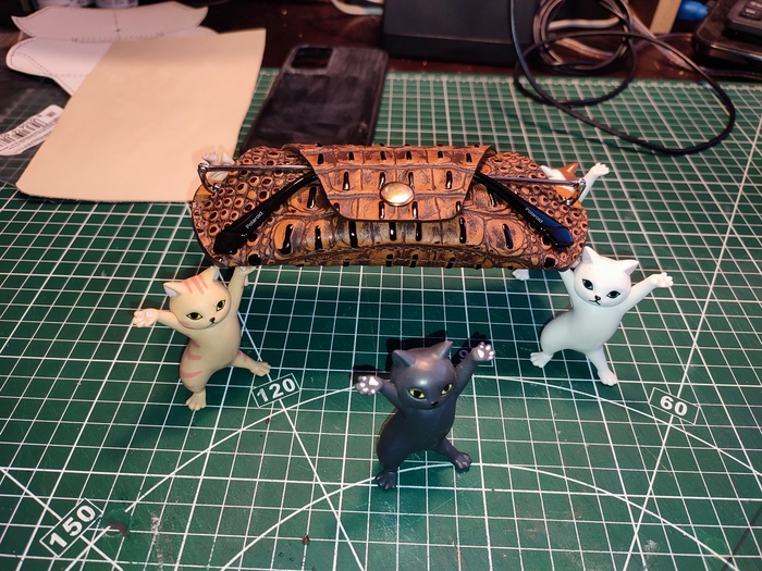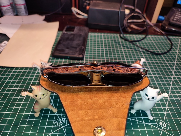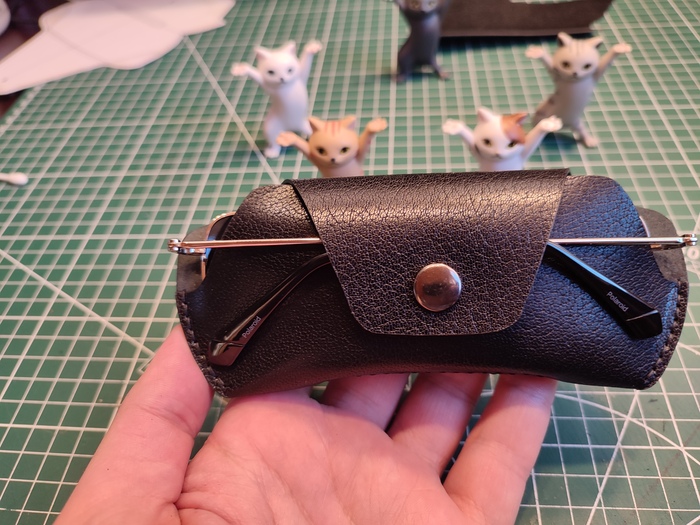 Начал с футляра для очков. Тем более, что я переделал выкройку, изменил ширину подносника, что в свою очередь повлияло на ширину футляра, а так же расположение кнопки. Теперь он стал чуть тоньше, примерно на сантиметр, компактнее, а очки в нем сидят более удобно. Ну и от слов к фото:
