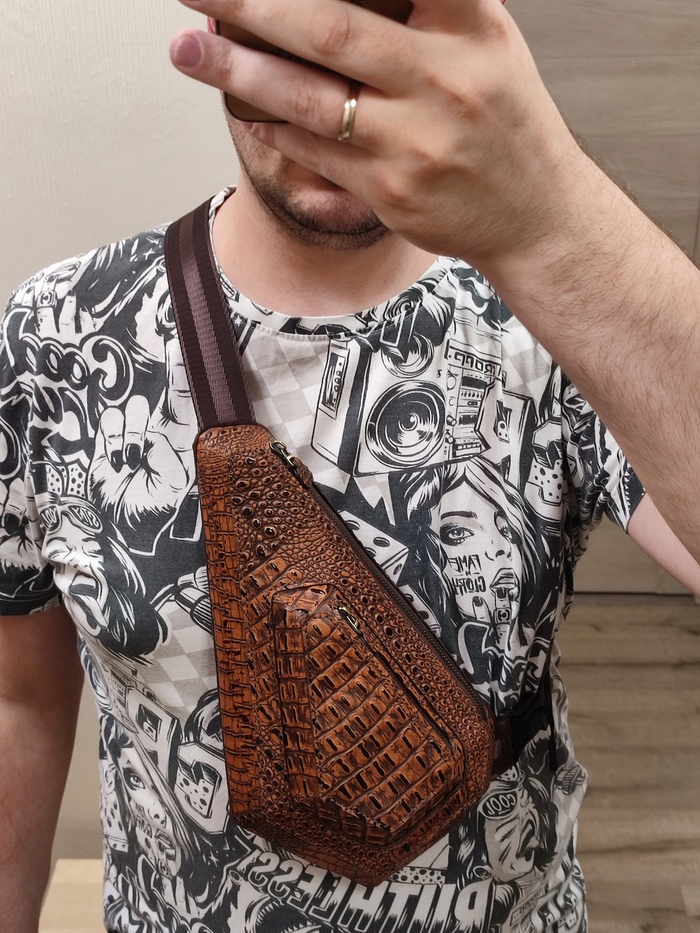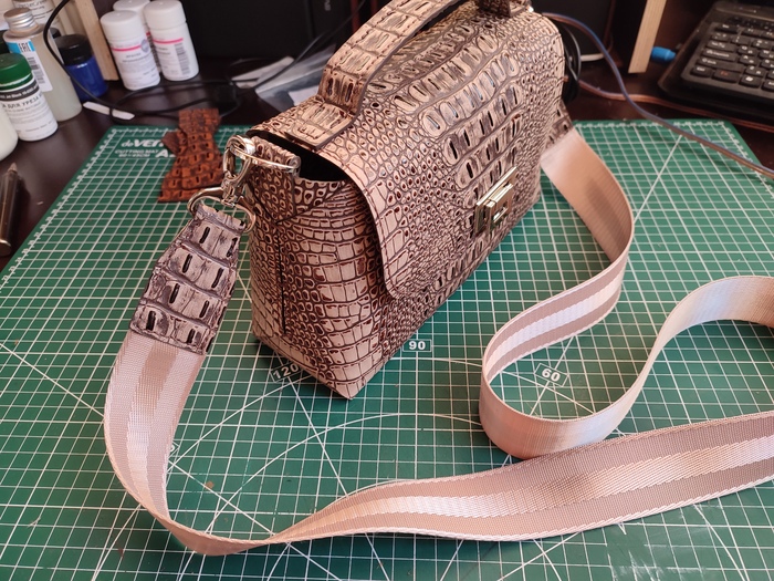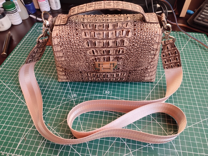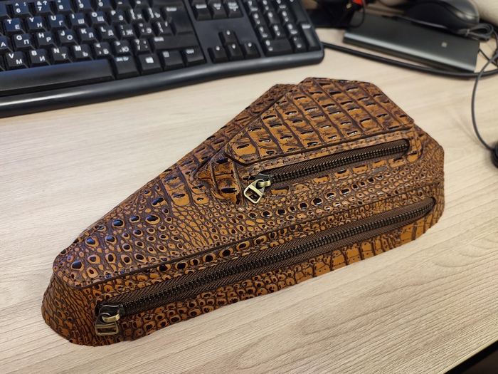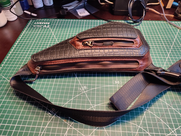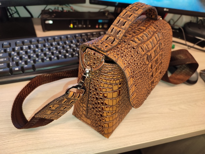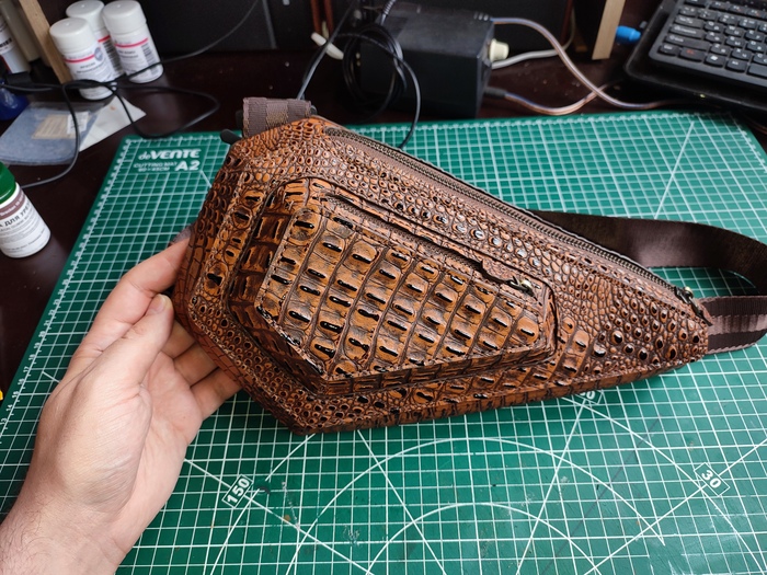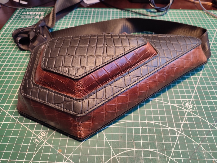 От скуки поехал в магазин по продаже кожи и всего-всего-всего, хотелось чего-нибудь эдакого. Нашел интересного крокодила из говядины и решил перешить свою сумку на грудь. Вот эту: