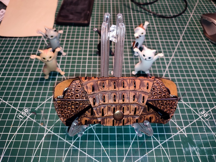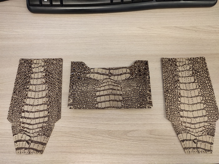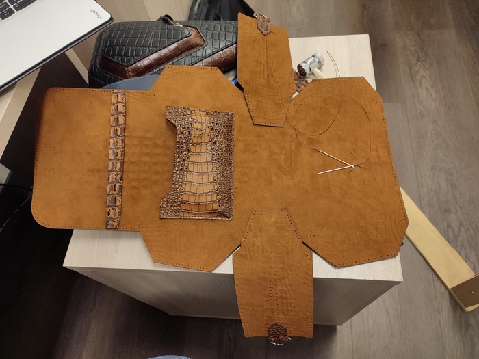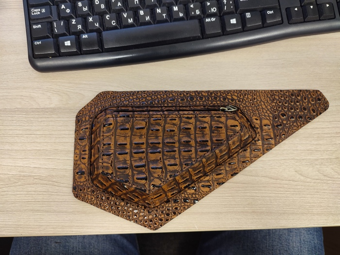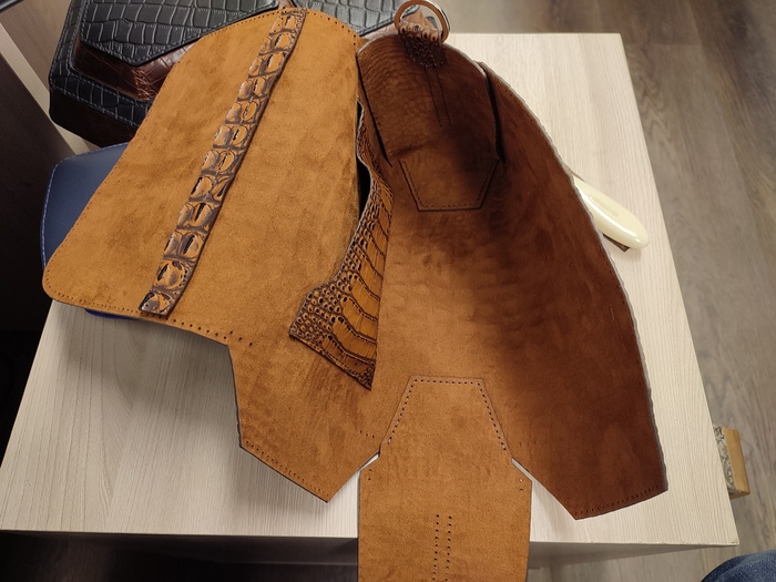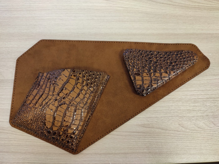 После сумок жене и себе остались обрезки от говяжего крокодила. И посетила меня мысль собрать себе полный сет: сумка, футляр для очков, трифолд, обложка на паспорт (если хватит).