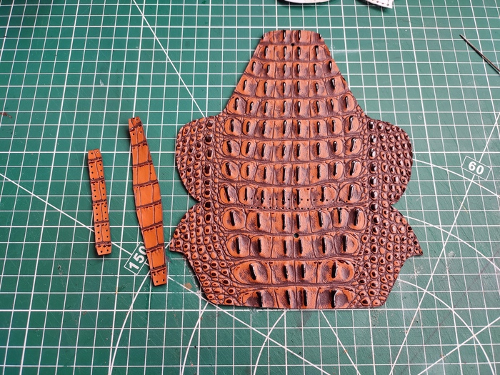 Выкройку распечатываю, клею на картон, пробиваю все отверстия, а только потом клею на кожу. Так получится аккуратнее.