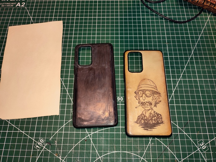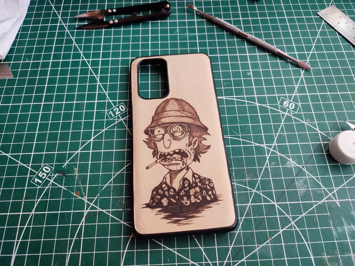 Далее перенес рисунок на кожу, выжег. Обработал водоотталкивающей пропиткой в два захода. Вырезал по шаблону и вклеил на контактный клей. Как не старался, но получилось все равно кривовато. Думал, что с контактным получится перепозиционировать, если не прижимать. Но фиг там плавал, только коснулась кожа чехла - хрен отдерешь. Вокруг окошка для камеры получилось криво. Дальше подложил листок бумаги и пошло как по маслу, он не приклеился и позиционировать можно было перед склейкой. Следующий чехол так и буду делать, через подкладку бумаги, сдвигать по миллиметру и укладывать аккуратно кожу.