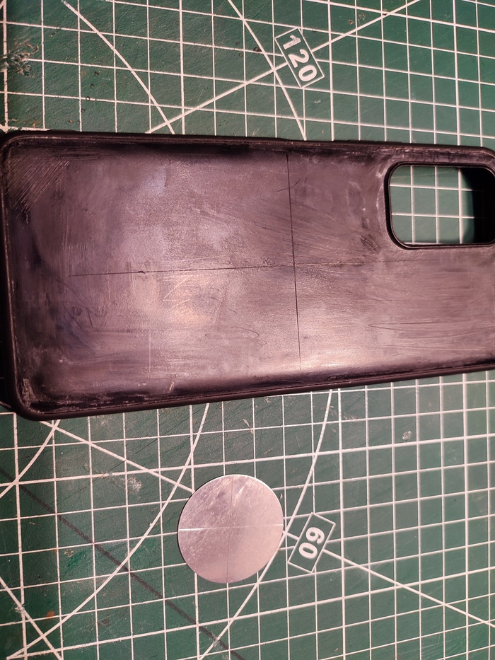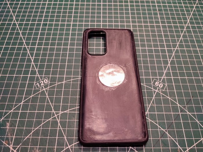 Чехол доработал, на горелке разогрел металлическую пластину и вплавил в него. Это сделано потому, что если ее просто вклеить внутрь, то она слабо держится на магните держателя и на кочках телефон отваливается. Пробовал несколько разных, результат одинаковый.