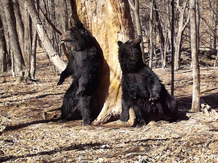 На фотоловушку национального парка «Земля леопарда» в Приморском крае попали два самца бурого медведя третьего-четвёртого года жизни у меточного дерева, начавшего свой рост ещё два века назад. Медведи в кадре уже отделились от матери и живут самостоятельной жизнью, но ещё какое-то время держатся вместе.