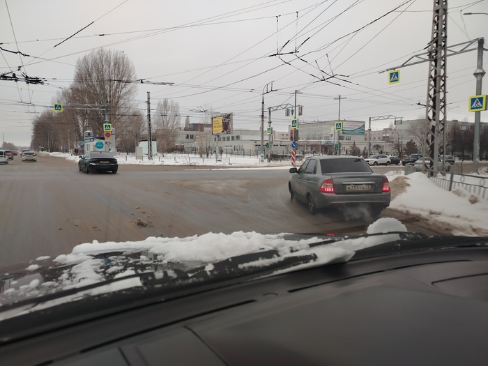 Таксист поворачивая на красный свет светофора чуть не задавил пешехода идущего на свой зеленый