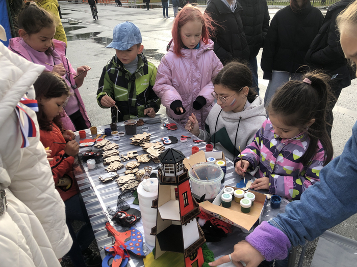 А тут мы школьникам рассказываем об истории традиционных игрушек (вдалеке видно меня в красной рубахе и старшую дочкув синей футболке):