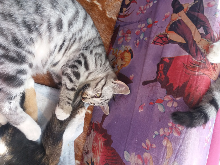 А тут, пока он спал, пришла кошечка. Тощая, но видно что котята есть. Я ей дала немного сосисок, и она ушла. На следующий день она вернулась, дала себя погладить, поела сосисок и ушла. А ночью в коридоре мяуканье. И тонкое такое, как у котенка. Вышли посмотреть, включаем свет, а там и правда, котёнок с кошкой! Совсем маленький, только глаза открыл. Мы его унесли из дома, положили на мягкий стул под навес и ушли спать. Ночью больше не мяукал. А днем на стуле его не оказалось. Ну, ладно. Часа через четыре, из коридора, снова мяу слышно. Пошли смотреть. Мяукает, а не видно. А он залез в большой сапог и там сидит. Кошка куда то ушла. Ну, я решила дать им имена. Кошка теперь Мира, а котенок Феля. Дала ему немного творога и молока. На следующий день котёнок был не один. Появились его брат и сестра. Они были более дикими, чем Феля. Девочка чёрного цвета, с пятнами. А братьев котят вообще не отличишь! Оба серые, с полосками. Только Феля чуть темнее. Девочку Кусей назвали. А другого котенка Миракл. Странное имя, но ему подходит. Сначала пытались их относить с участка, но вечером отнесешь, а утром они снова тут. В итоге сдались. Оставить у себя не вариант, разве что Кусю. Мальчики вырастут, а у нас кот. Драться будут. Котята подросли, приручились. Теперь в доме спят. Феле мы нашли дом, а Кусю себе оставим. Мира сама выживет, она охотица. И Миракл.... мы его тоже берём в Москву, пристариавать будем. Вот так умная кошка своих котят пристроила)