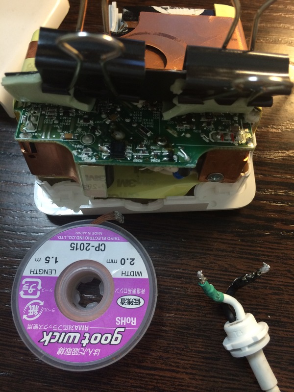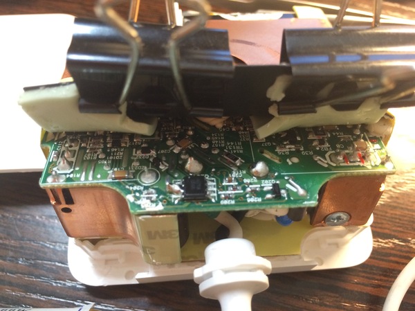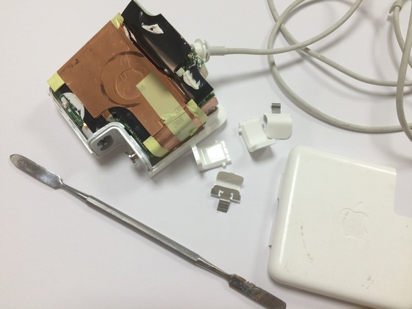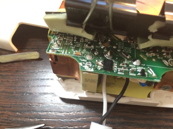 Приступаем к разбору. Для начала прогреем феном по периметру блок питания. Затем берем пасатижы (утконосы) и движением на разжатие пробуем вскрыть блок. Сразу предупрежу, вариаций блоков от Apple очень много. Некоторые вскрываются легко, а над некоторыми приходится повозиться...Без применения грубой силы не обойтись :)
