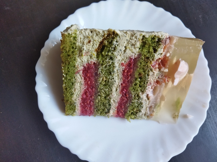 Внутри шпинатный бисквит, мятный крем-чиз и малиновое конфи. Мята натуральная,пробитая блендером с сахаром до состояния пюре. Вкус получился очень свежий, мята даёт прохладу, а малина - благородную кислинку. Бисквит мягкий, сочный и пористый, не нуждается в пропитке, травяного привкуса нет.