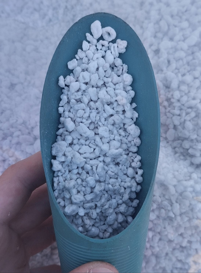 Перлит. Обладает такими же свойствами, что и вермикулит. Способен впитать жидкости до 400 % собственного веса. Кому-то не нравиться, что после полива перлит часто оказывается на поверхности и выглядит как перхоть. Так же на солнце имеет свойство зеленеть. Но мне компонент нравиться, к тому же он довольно крупный и разнообразит размер фракции в грунте.