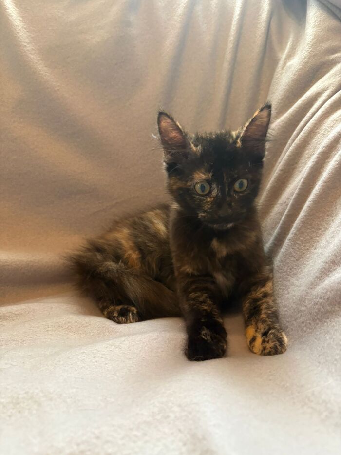 Ей около 6 месяцев, здорова, привита, обработана от паразитов, приучена к лотку и когтеточке. Очень контактная девочка, прекрасно ладит с сородичами и даже с крупными собаками. Любит, чтобы её гладили, любит играть, с детьми-идеально!Есть сухой и влажный корм, в еде неприхотлива. Прекрасно остаётся дома одна, но очень ждёт возвращения, радуется и ласкается.