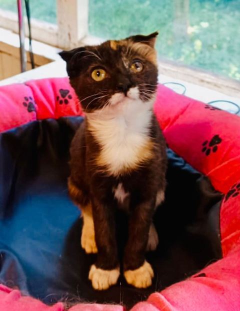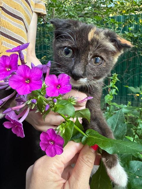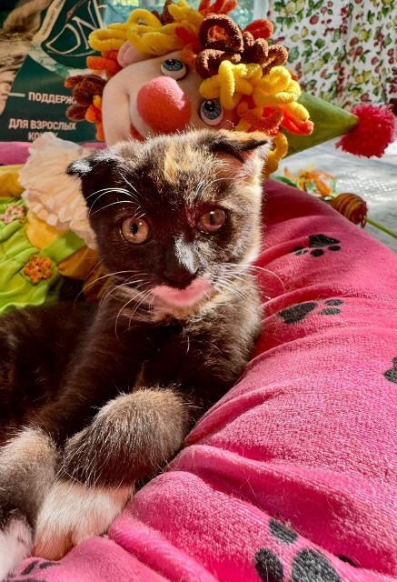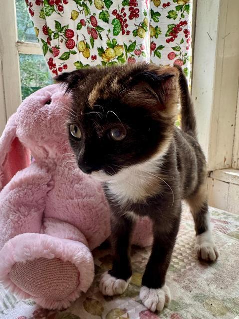 Котёнок-малютка в добрые руки. Девочка, трехцветная, вислоухая, 2 месяца. Ласковая и игривая, мурчит, играет с удовольствием. Лоток знает. Обработана от всех паразитов. На одном глазу маленькое пятно на роговице. По заключению офтальмолога, на зрение это не влияет.
