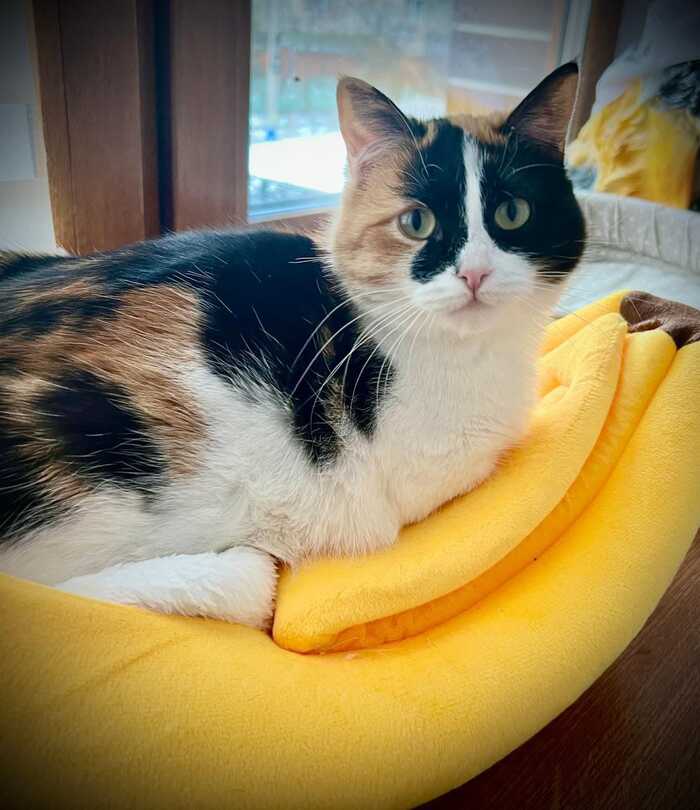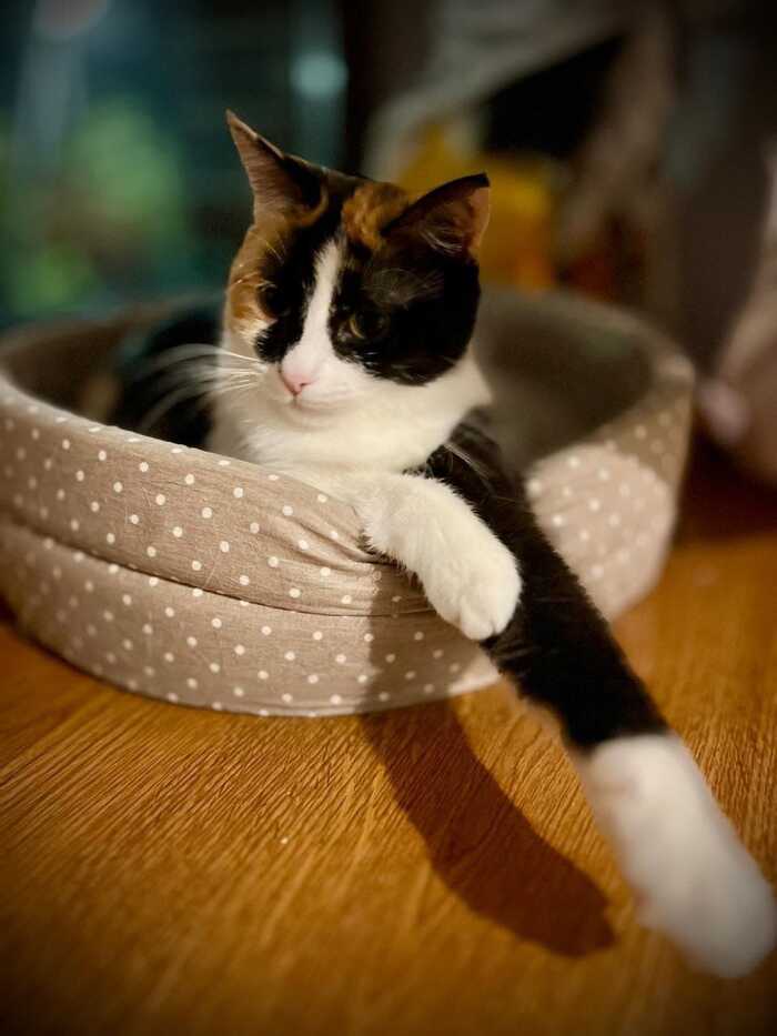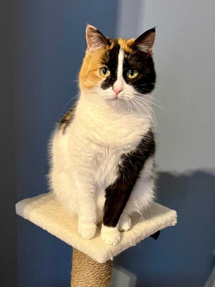 Кошка Майя, 2 года, стерилизована, здорова, лоток без проблем, приучена к когтеточке. Трехцветная кошка с трехцветным характером. Кругленькая, мягкая и уютная. Любит полежать на ручках кверху пузиком, посидеть носик к носику с хозяином, помедитировать в окошко. Обожает всякие лежачки, умеет принимать уютные позы, отличная фотомодель. Очень ласковая и тактильная. Собак боится, точно не уживется. С кошками уживется, но она единоличница, ей будет лучше всего одной в семье. Ест сухой корм. Находится в Москве. Метро "Кокошкино".