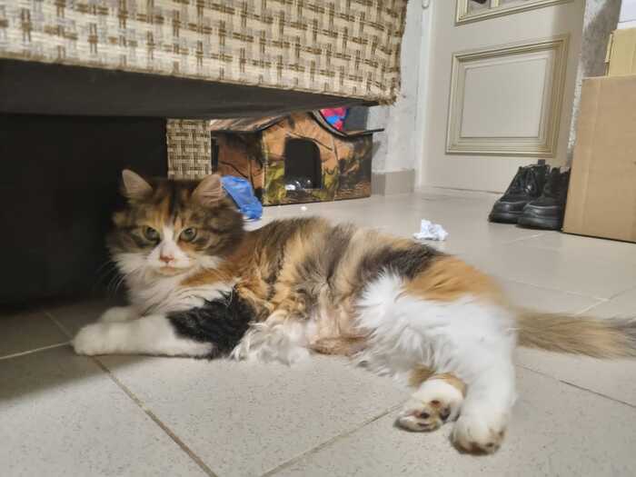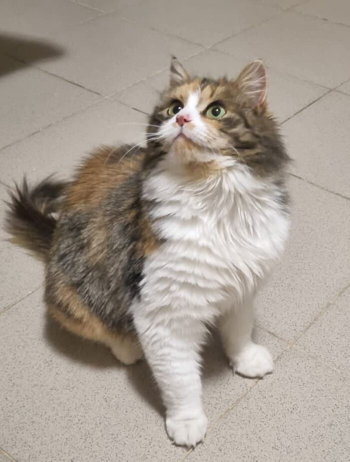 Ей 1.5 года, очень спокойная. Спит на спине, сложив лапки, очень ждет любящих хозяев! Очень любит людей, хочет общаться, громко мурлычет. Здорова, знает лоток, стерилизована. Отдается одной кошкой. По старой примете трехцветная кошечка приносит в дом счастье! Ждем Вас.