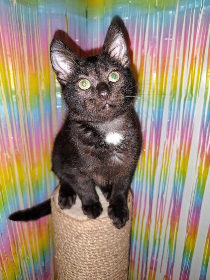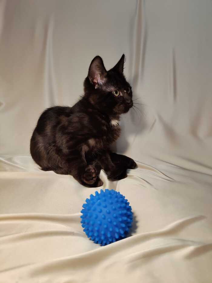 Маленький красивый котенок. Чёрненький с красивыми разводами на шерстке и белым пятнышком на шейке. Ему 3,5 месяца. Очень ласковый и игривый. Лоток на 5+. Территориально: Городской округ Химки, посёлок Лунево.