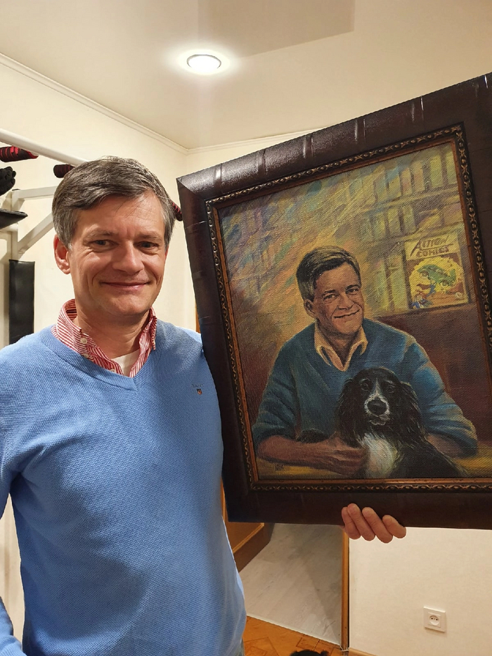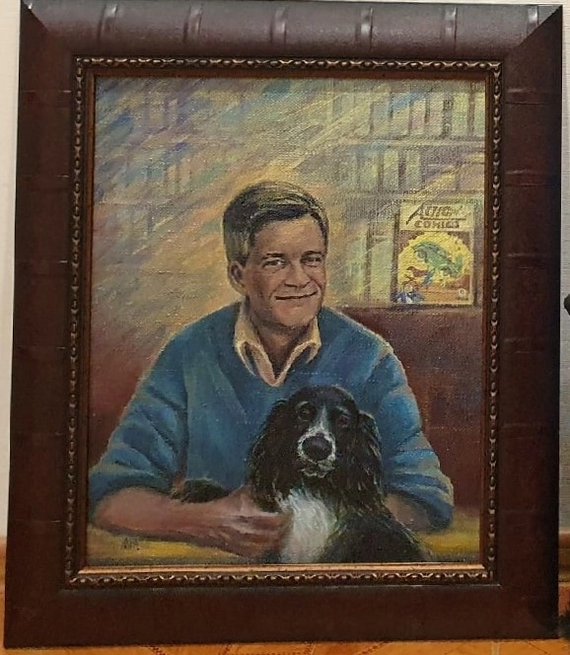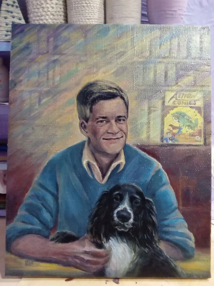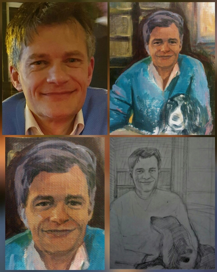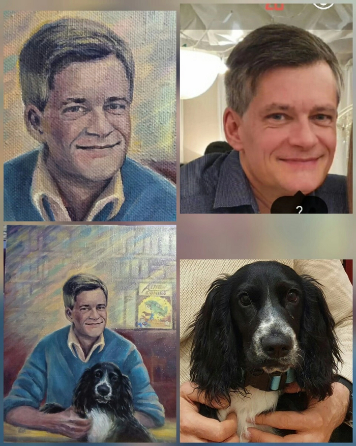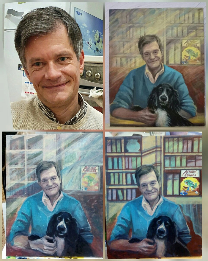 Это была присказка, не сказка. А сказка такова - получила я заказ на портрет. Симпатичный мужчина с не менее симпатичной собачкой. Также на картине должна присутствовать пасхалочка в виде любимого комикса. С энтузиазмом взявшись за работу, и еще раз взявшись, и еще раз... Когда я поняла, что по нескольку раз в день я перерисовываю лицо на портрете то решила сменить тактику, а вернее базовое фото, на котором из-за мягкого освещения плохо было видно строение лица. Теперь все пошло гладко. На фотографии резкий свет очерчивал все контуры, портрет был завершен. Но, как оказалось, получилось не похоже.. Получив еще порцию фотоматериала (и глубоко выдохнув)) я приступила к работе в третий раз. Волшебное число три сработало, все получилось. Все довольны. Особенно я, ведь на всех фотографиях лицо очень сильно отличалось, и мне трудно было понять, как на самом деле выглядит оригинал.