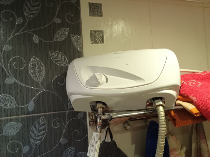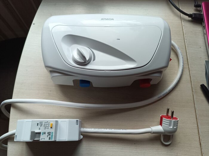Пошёл я в строительный магазин и взял там самый дешёвый — Ariston ATMOR CLASSIC 501 5 KW TAP (плюс он единственный в наличии не был смесителем). Плюс необходимое для его подключения: полутораметровый шланг, 5 метров кабеля и вилку с заземлением, УЗО и коробочку для него, наконечники и клеммы, выключатель.