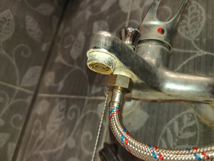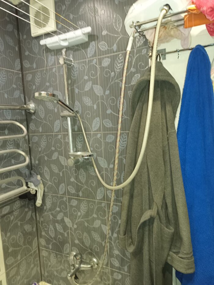Электрика закончена, приступаем к сантехнике. Тут всё просто: скрутил лейку душа со смесителя, прикрутил к нему новый шланг, второй конец шланга прикрутил ко входу нагревателя (синий колпачок), саму лейку — на выход нагревателя (красный колпачок).