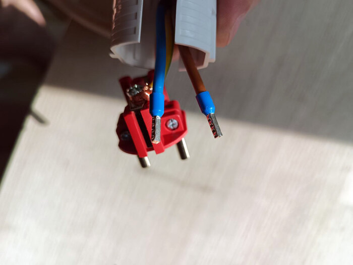 Вилка обычная на 16 А. Для одного ТЭНа хватит, для двух — маловато (именно поэтому в руководстве требуют подключать нагреватель непосредственно в щиток). Впрочем, есть вилки на 32 А, но выглядят они уже совсем по-другому, я же буду включать нагреватель в обычную евророзетку, к которой подведён кабель 3×2,5). Неожиданные бонусы от кабеля — из-за диаметра он герметично заклинился во втулку. Собрал по феншую, с наконечниками.