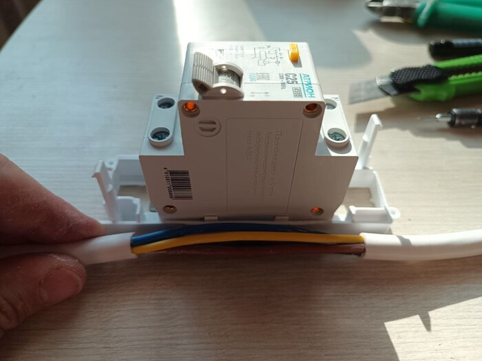 Нагреватель имеет максимальную мощность 5 кВт, что при напряжении 220 В даёт ток 22,7 А. Я решил обойтись проводом сечением 2,5 мм², поскольку не планировал использовать оба ТЭНа сразу (ха-ха, наивный). Поэтому взял кабель ПВС 4×2,5 (достаточно 3×2,5, но — что было в магазине…) и УЗО на 25 А. Лучше для этой мощности всё же брать 4 мм² (кабель 3×4) и настоятельно рекомендую многопроволочный провод.