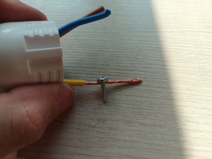 Я видел много накопительных нагревателей со встроенным в кабель УЗО, поэтому решил сделать так же — врезать УЗО в кабель, немного отступив от вилки. УЗО подключил в разрыв основных проводов, лишний провод пропустил под ним.
