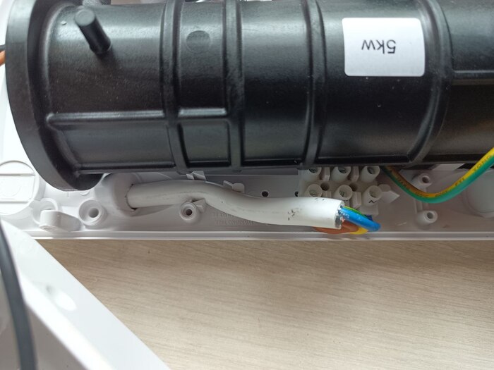 Осталось подключить кабель к нагревателю. Проломав дырку в предусмотренном месте, завёл кабель внутрь. Для подключения проводов в колодку пространства просто завались, да…