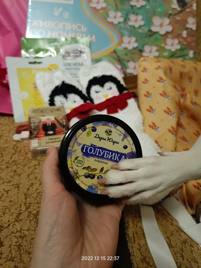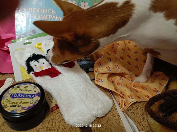А тут я пыталась сделать общее фото подарка, но у меня постоянно пытались украсть носки и украли в итоге..