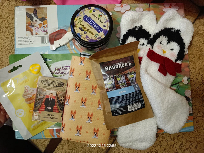 Кроме перечисленного в посылке был басячий фартук, масочки для релакса, шапочки для бокалов и интересная детективная настолка.