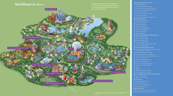 Сегодня Мир Уолта Диснея (Disney World) - огромный и все еще растущий курорт, который зарекомендовал себя как одно из самых популярных мест семейного досуга. В нем расположены, не много не мало, четыре огромных, полноценных тематических парка и два аквапарка (без учета Страны Рек), большая торгово-развлекательная зона и множество отелей курортного типа.